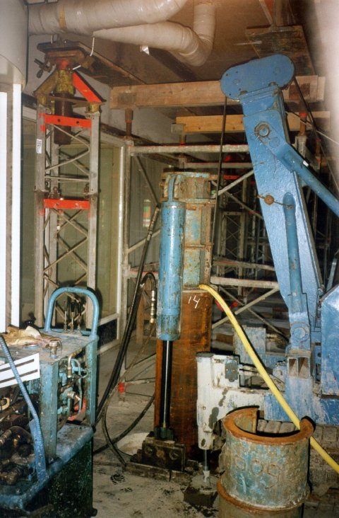 Het trillingvrij drukken van stalen buispalen via 2 kelderniveaus en een op de onderste keldervloer gemonteerde buis, ca. 1,5 meter onder het grondwaterniveau, uitgevoerd in juli 2001.