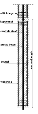 (trillingarm ingedreven, grondverdringend) De Schroef-Verbinding-paal is een paal opgebouwd uit geprefabriceerde gewapend betonsegmenten. Elk betonsegment bevat een doorlopende centrale wapeningsstaaf met schroefdraad. Door middel van deze schroefdraad worden de elementen onderling gekoppeld, zodat een paal met doorlopende wapening ontstaat. De verbinding kan drukkrachten, trekkrachten en momenten opnemen. Om corrosie tegen te gaan kan de schroefdraadverbinding van de omgeving worden geisoleerd door middel van een vetomhulling en een afdichtingsring. De paalelementen worden met grote precisie geprefabriceerd. Met name de kop-vlakken worden nauwkeurig haaks ten opzichte van de paalas uitgevoerd. Scheef op elkaar plaatsen van de elementen is bij dit systeem niet mogelijk. Daardoorontstaat een nauwkeurig rechte paalas. Het SV-verbindingssysteem geeft een verbetering ten opzichte van voorheen gebruikte verbindingen in buigstijfheid, rechtheid van de paal, trekopname, momentopname, corrosiebestendigheid, betrouwbaarheid en kostprijs. Door de verbeterde mechanische eigenschappen van de koppeling is het mogelijk geworden deze segmentpaal van een verbrede voet of voetplaat te voorzien. De paal wordt ingedreven met een valblok. Hiervoor is een speciale verende heimuts is ontwikkeld, die zorgt voor een optimale aanpassing tussen valblok en paal. Hiermee wordt bereikt, dat een zo groot mogelijk gedeelte van de heienergie gebruikt wordt voor het indrijven van de paal, zodat slechts een klein gedeelte van deze energie in de vorm van trillingen aan de omgeving wordt doorgegeven. Deze techniek maakt het tevens mogelijk de palen met een relatief klein valblok diep in de vaste laag te drijven, zodat een grote draagkracht bereikt kan worden. Voor dit paalsysteem zijn heimachines in diverse grootten beschikbaar. De paal is zeer geschikt voor gebruik bij beperkte werkruimte of bij beperkte toegang. |