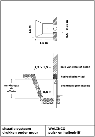 | Voorbereiding Eerst wordt een strook langs de muur tot nabij onderkant fundering ontgraven. Dan wordt plaatselijk bij de te maken paal ontgraven zoals aangegeven op bijgaande situatieschets. Uitvoering Opdrachtgever zorgt voor een wateraansluiting nabij de ontgraving. Opdrachtgever handhaaft de grondwaterstand onder de onderkant van de ontgraving. De paal wordt centrisch onder de muur gedrukt. Daarbij wordt de muur als tegengewicht gebruikt. De benodigde tegen- druk varieert afhankelijk van de constructie, de paal- specificaties en de grondslag van 50 kN tot 2000 kN. Afvoer pulsgrond (indien van toepassing) is voor rekening van opdrachtgever. Indien grindlagen gepasseerd moeten worden, kan niet met de gebruikelijke kleine werkhoogte gewerkt worden. |